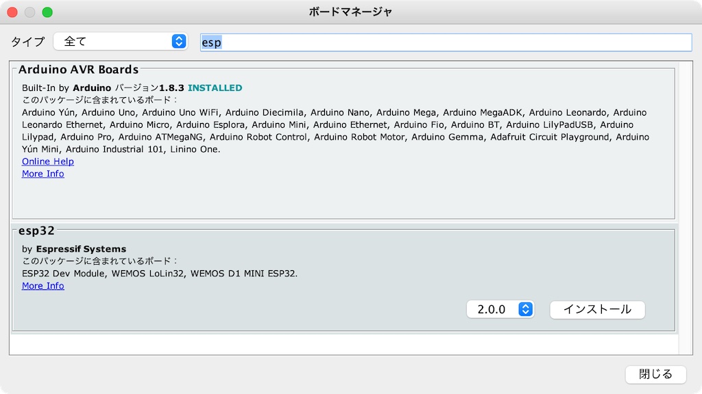 すると、「ツール」「ボード:」メニューの中で、esp32が選べるようになります。これでインストールします。