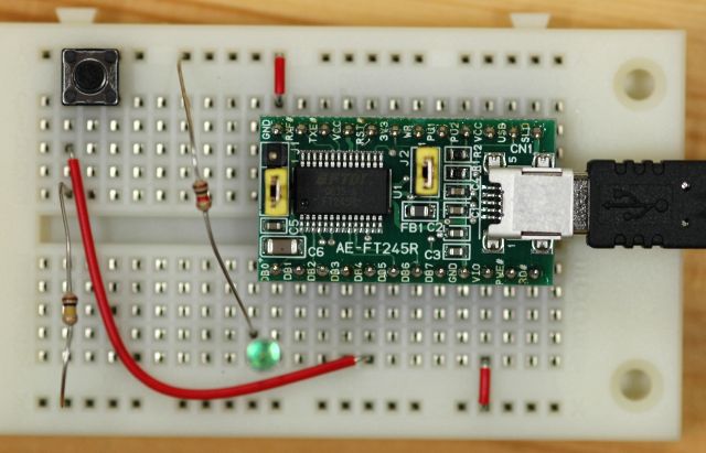 このスイッチを押すとLEDが光るCプログラムを,bitmodeのサンプルを元に作ってみた. LEDはData 0 (LSBのビット) に,スイッチはData 4に接続している. コンパイルの方法は冒頭のコメントの書かれている通り。 (Pukiwikiの関係で、逆スラッシュ¥が疑問符?に化けているので注意)