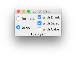 とあるレストランのランチは税別1,000円です。ランチにはオプションがあって、ドリンクを追加すると税別200円、サラダを追加すると税別300円、ケーキを追加すると税別500円です。全部追加すると税別2,000円です。この金額に消費税がかかります。消費税は、お店で食べると10%で、持ち帰りだと8%です。このレストランでアルバイトする友人のために、税込金額を計算するアプリを作ってあげることにしました。以下のように動くよう作ってください。