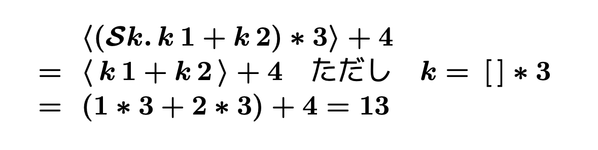図2の 1 行目では、括弧の一番内側の部分である、 (Sk. k 1 + k 2) の部分から実行されます。この部分は(Sk. …)という形の shiftの式ですから、一番近い reset 演算子までで区切られた継続を切り取ります。今回の例では、shiftの式(Sk. …)とreset の間にある「残りの処理(継続)」は「shift の式全体の計算結果はまだわからないが、その結果がわかったら、そこに3をかける」というものになりますから、穴あきの式([ ]*3)と表すことができます。この継続を 切り取って、k という変数に登録して後で使えるようにした状態が、図2の2行目に表されています。2行目に出てくる k = [ ]*3 という式は、k(x) = x*3 と書くのと同じ意味と思って構いません。この後は、k という関数を呼び出して四則演算の計算を進めていきます。3行目にでてくるreset演算子は、(もうshift演算子がないので)結果には何も影響しないので、無視して構いません。関数 k が2回呼び出されて、(k 1 + k 2) + 4 = (1*3 + 2*3) + 4 = 13 と計算することができます。