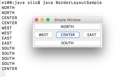 演習:このプログラムを参考にして、 上で作った二つのボタンのプログラム、Simple Buttonに対して、レイアウトマネージャのFlowLayoutを使って、左寄せ、センタリング、右寄せを試してください。そして、ウィンドウのサイズを変更した時の、ボタンの移動を観察してください。