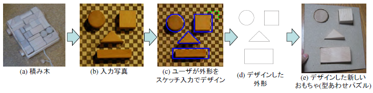 既に実世界に存在する物体Aと組み合わせる別の物体Bを設計するということは大変 な作業である.通常,物体Aの長さを計測して設計図を描き,CADシステムなどを用いて物体B のための図面をデザインすることが多い.本提案手法はデザインしたい物体Aの写真をレファレン スとして用い,コンピュータ上で写真の上から物体Bの図面をデザインしていく.この写真を撮影 する際に,チェッカーボードを一緒に写しておくことで現実世界との長さの対応を取る.本手法をい くつかの既存のおもちゃを元に別物体をデザインすることに適用した.ユーザがデザインした図面を ベクターデータとして出力し,レーザーカッターを用いて作品を出力することで物体Bを作成した. ユーザに使用してもらい,本システムの有効性を示す.