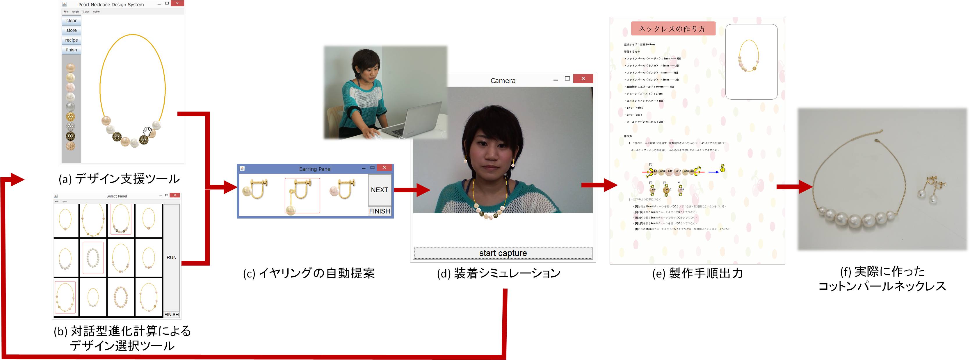 そこで,我々はネックレスを対象として,初心者が対話的にオリジナルデザインを考えるためのシステムを提案する。システムは2 つのツールから成る。1つ目は対話的にデザインをしていくデザイン支援ツールである。画面上でパーツを並べて出来上がりを試行錯誤することができる。もう1 つは対話型進化計算を利用したデザイン選定ツールである。デザイン支援ツールによってすでにデザインされた多くのデザイン画像の中から,より自分が欲しているデザインをシステムに提案してもらうために,対話型進化計算を利用している。WEB カメラで自分の画像を撮影した上にデザインしたネックレスをおいてみる装着シミュレーション機能もあり,自分に似合うか実際に作る前に確認することが可能である。最終的に選んだデザインを作るための製作手順出力も行い,それを見ながら実際に製作を行うことができる。